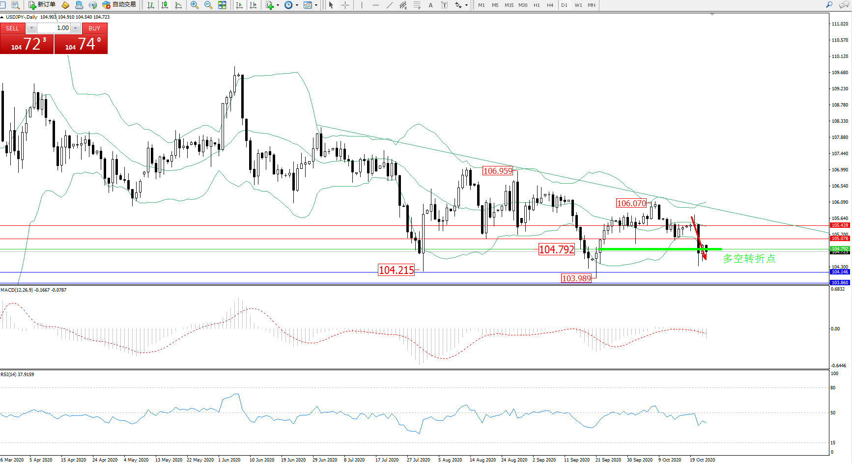 技术点评:长时间处于布林带指标中下轨区间弱势整理后,空头动力急速下挫,跌破布林带指标下轨附近后有进一步下挫态势,前期低位103.989位置近在咫尺破位在即,布林带指标呈收口走势后开始张口迹象,MACD指标处于0轴线下侧弱势徘徊中,RSI指标处于50均衡线下侧弱势徘徊后下挫中;