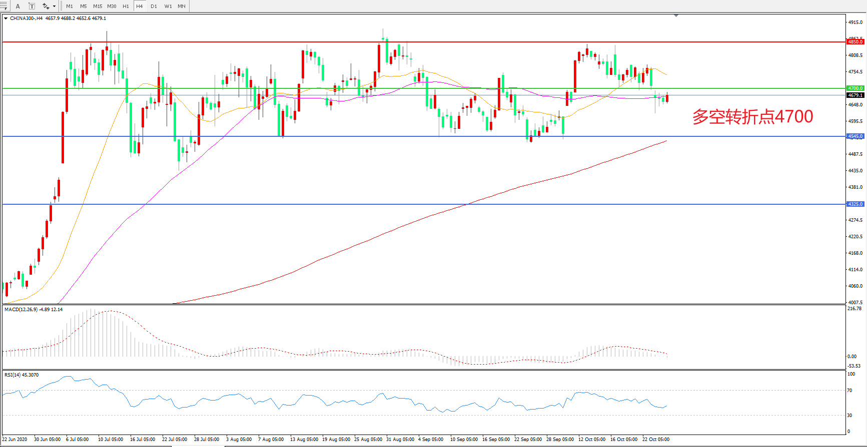 4小时图看,沪深300小幅反弹,整体表现有所回暖,但4700阻力仍未突破,55周期均线成为短期支撑, MACD红柱缩短,RSI指标向上,日内延续震荡概率较大。