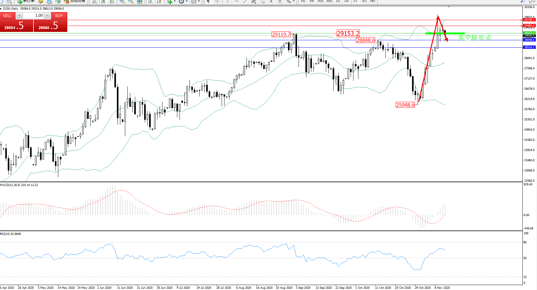 道琼斯指数11月12日(周四)收盘下跌317.50点,跌幅1.08%,报29080.17点。美股三大指数集体下跌,新冠疫苗不太可能改变美国和欧洲将渡过一个严峻冬天的局面,使投资者保持谨慎,新冠病例猛增加剧了更严格防疫封锁措施的担忧,并且进一步刺激前景黯淡之下经济复苏可能更加迟缓。特朗普政府将退出有关新刺激方案的谈判,留下参议院多数党领袖麦康奈尔恢复与众议院议长佩洛西僵持良久的对话。美联储主席鲍威尔表示,随着新冠病毒的传播,美国经济未来几个月可能面临挑战。投资者在等待另一种新冠候选疫苗的结果,另外在美国新冠确诊病例创纪录、死亡人数不断增加的背景下,美元也走势不稳。美联储主席鲍威尔表示,随着新冠病毒的传播,美国经济未来几个月可能面临挑战--尽管最近有疫苗开发的积极消息。