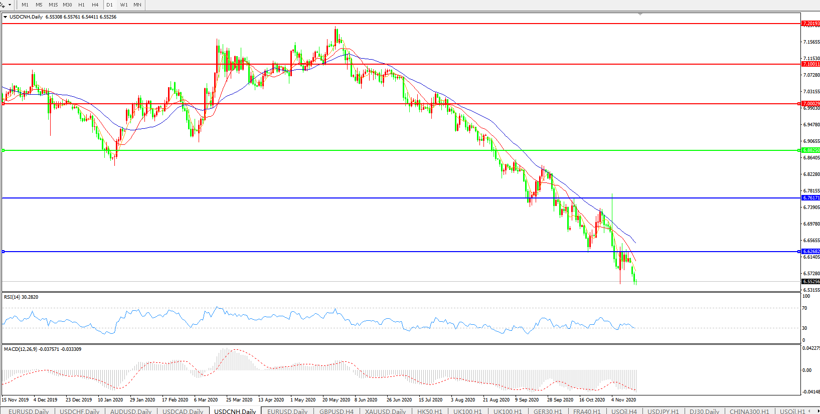 美元兑人民币USDCNH 日线图: