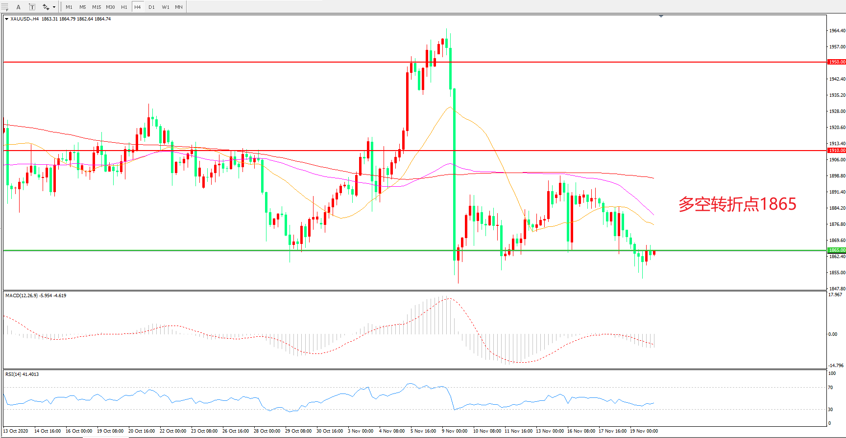 周四(11月19日),美元走强和美国新一轮财政刺激前景不明朗,对金价形成较大压力,现货黄金延续低迷表现,震荡下行后,收报1862.67美元/盎司。美元和美债收益率的飙升、显示出市场风险偏好的提高,近期金价反弹无力,上方承压后小幅回落,但整体仍属区间振荡,市场尚未给出明确的方向选择。