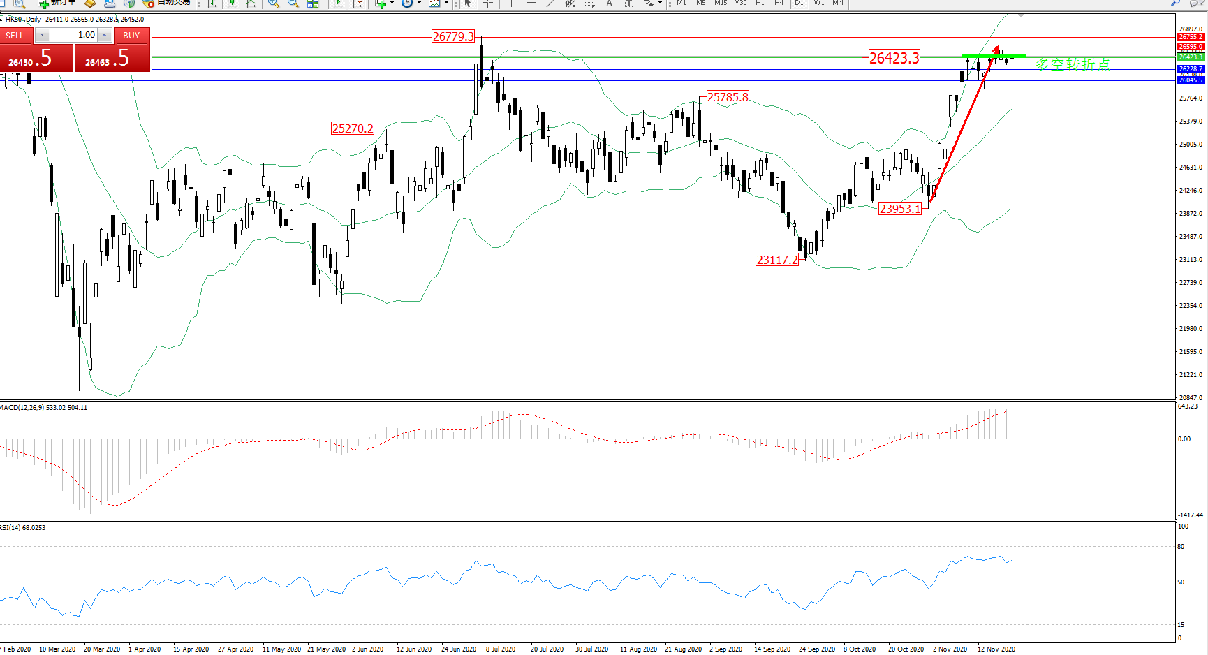 香港恒生指数11月20日(周五)收盘上涨94.57点,涨幅0.36%,报26451.54点;港股恒指全天震荡,恒生科技指数涨1.19%。汽车股、港口航运股依旧是市场焦点,表现极其活跃,恒生科技股涨跌各半,大型科技股较强,网易升近6%,美团、阿里、腾讯均上扬;燃气股板块领跌,餐饮股、猪肉概念股、收租股、航空股普遍下挫。今日南下资金净流入56.97亿港元,大市成交额为1326.4亿港元。港股市场长期价值回归的趋势,并看好在大宗商品、香港本地股、内地大型传统行业、科技公司和消费品公司上的机会。相信随着战胜疫情愈发临近,香港经济将愈发企稳复苏,带动相关行业估值修复。新冠肺炎疫苗有望短期内面世、中国经济料可大幅反弹以及“十四五”规划带来的新机遇等多项利好因素涌现,看好明年中资股表现,估计2021年中资企业盈利增长达20%,维持对H股“增持”评级。预测恒指明年底目标为29700点,较现价有12%潜在升幅。