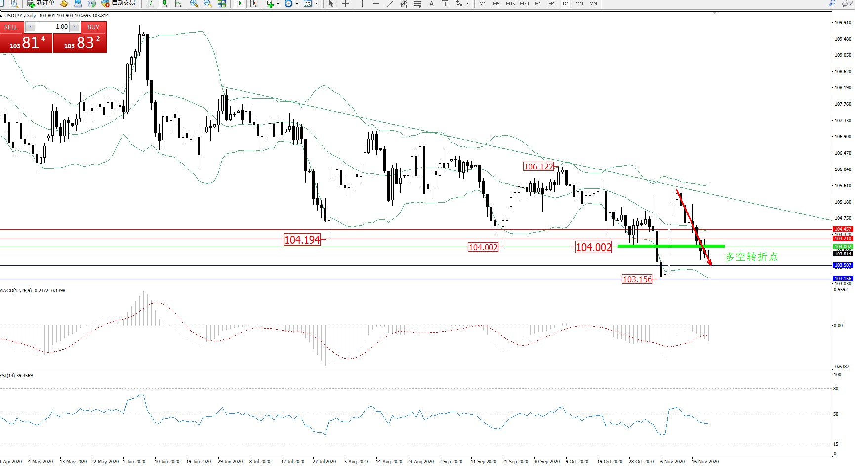 交易策略:104.002下方看跌,目标103.507、103.156
