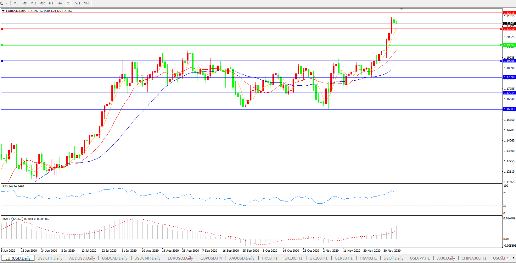 技术面简析:日图均线呈有序多头排列,汇价大幅冲高后小幅回落,MACD运行于0轴上方且量能0轴上持续放量 ,RSI超卖区域小幅走弱,预计短期汇价大概率将在整理后进一步上行。