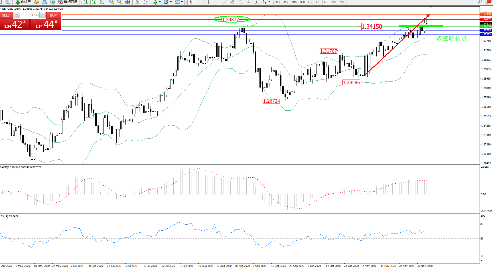 交易策略:1.34150上方看涨,目标1.34837、1.35368