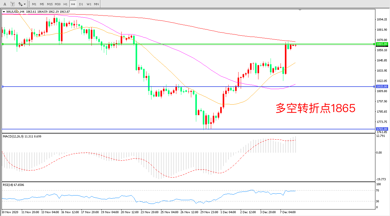 4小时图看,金价自低位大幅拉升,短期走势异常强势,1865成为上方重要阻力,如能顺势突破,有望掀起新一轮的大涨,均线系统拐头向上,MACD红柱增加,RSI指标走平,日内震荡上行概率较大。
