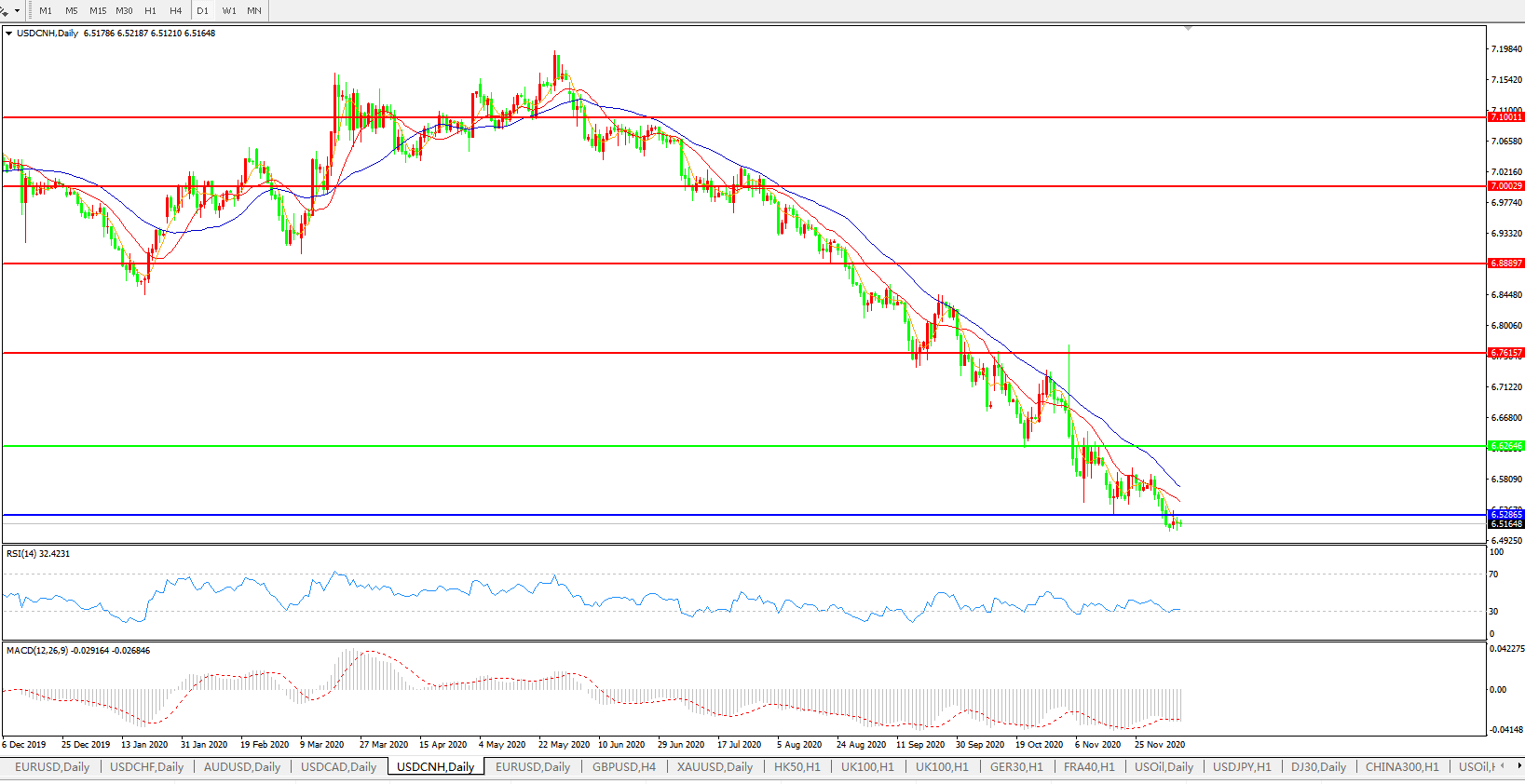 美元兑人民币USDCNH 日线图: