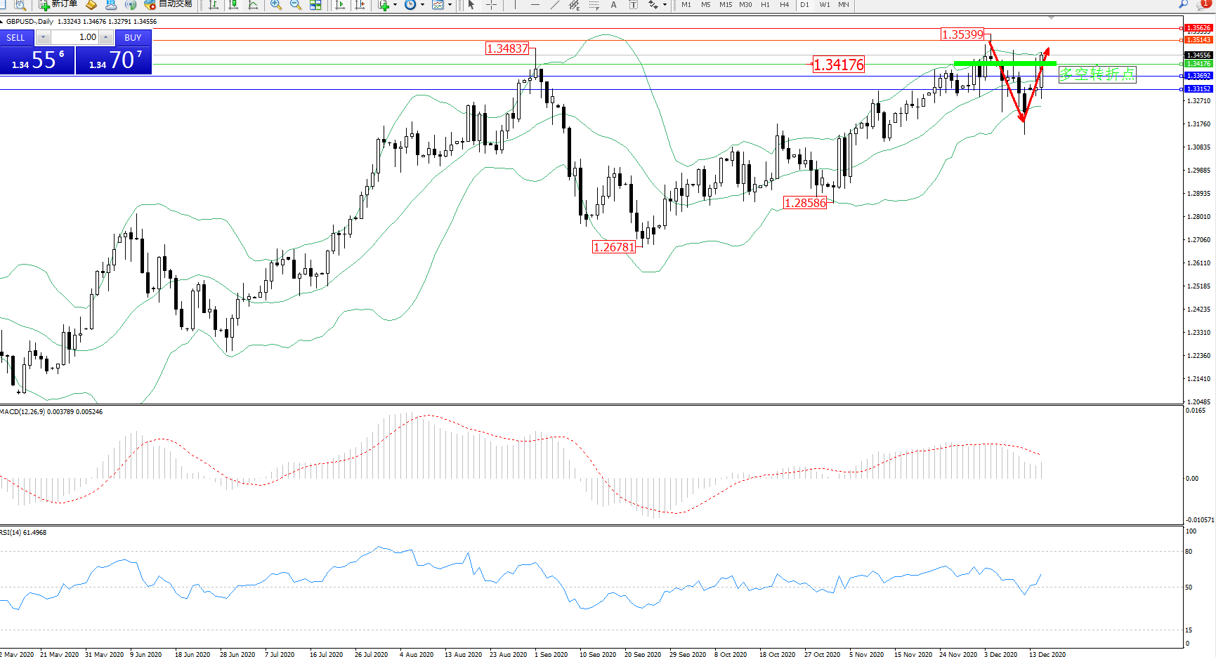 交易策略:1.34176上方看涨,目标1.35143、1.35626