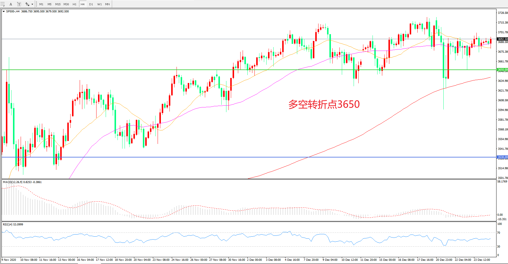 4小时图看,标普500延续高位震荡,整体波幅不大,下方支撑较为明显,均线系统逐渐走平,3680成为运行中枢,MACD红柱缩短,RSI指标走平,日内延续震荡概率较大。