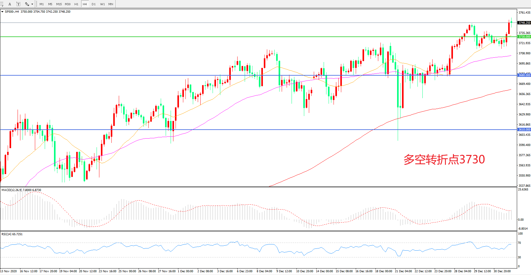 4小时图看,标普500阳线连续拉升,短期走势偏强,21周期均线依然成为下方支撑,上行趋势相对完好,MACD红柱缩短,RSI指标走平,日内延续上行概率较大。