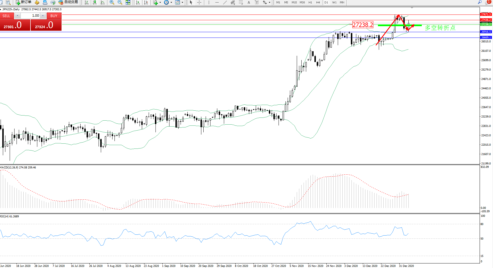 日经225指数1月6日(周三)收盘下跌109.13点,跌幅0.40%,报27049.50点。自新冠病毒大流行开始以来,日本单日新增确诊病例数首次超过5000例。面对不断扩大的感染规模,日本政府决定于7日在首都圈的一都三县再次启动紧急状态。据日本广播协会电视台统计,5日日本新增新冠确诊病例4915例,累计确诊病例达到253440例;新增死亡病例76例,累计死亡3756例,日本单日新增确诊和死亡病例数双双再创新高。2021年以来日本疫情形势依然严峻,近几天单日新增确诊病例数都在3000例以上,而且约半数集中在首都圈,即东京都及其周边神奈川、墙玉、千叶3个县。据日本富士新闻网:日本北海道新增115例新冠肺炎确诊病例,新增5例新冠肺炎死亡病例。兵库县新增248例新冠肺炎确诊病例。日本经济再生大臣西村康稔:紧急状态会影响就业,将会采取适当措施。