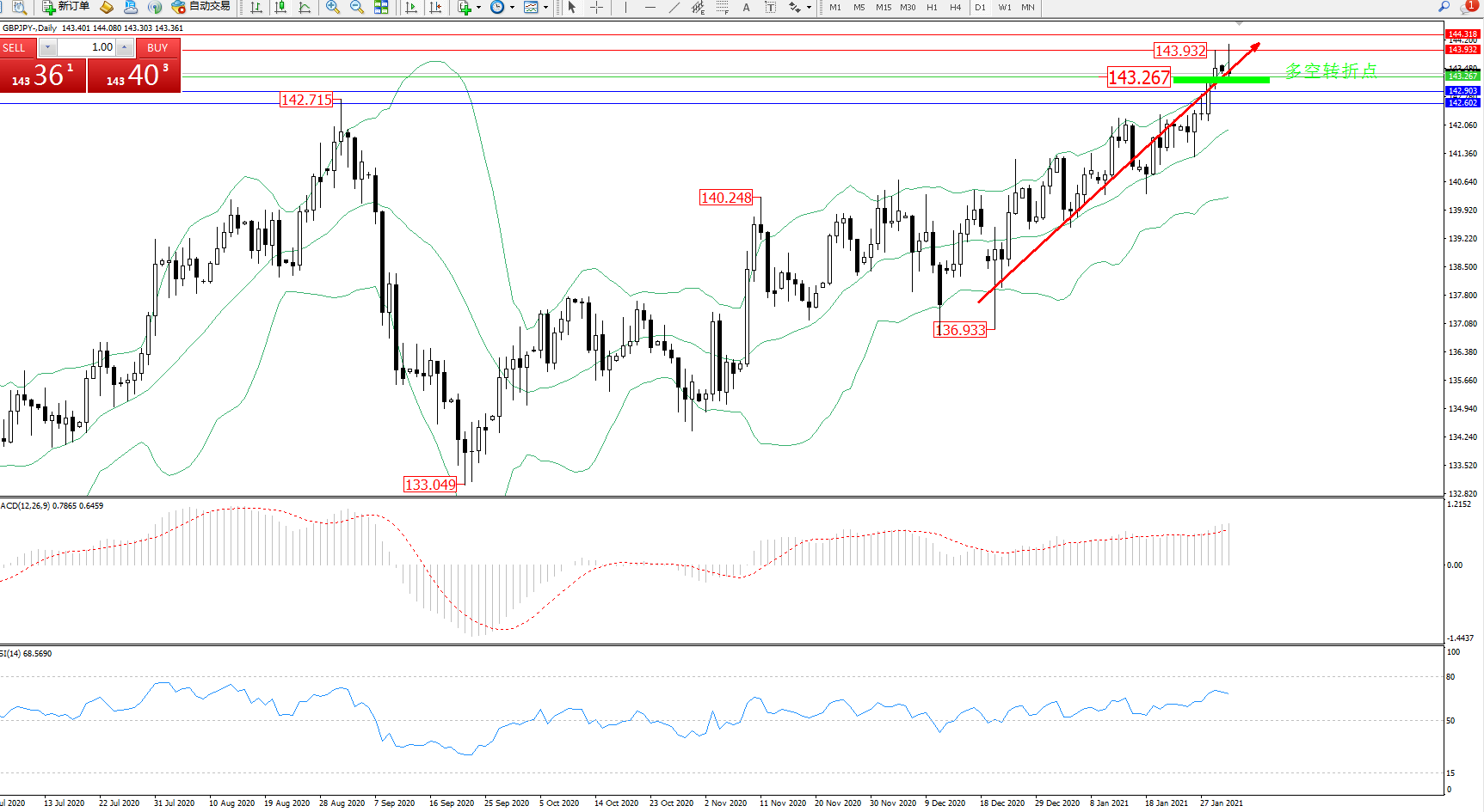 英镑兑日圆维持143.259位置高位整理,英国制造业增长情况的指标在1月降至三个月低位,因新冠疫情和英国退欧的影响叠加,令新出口订单承压,再加上有迹象显示供应链中断和通胀压力升温。英国1月IHS Markit制造业PMI指数终值为54.1,高于初值52.9,但不及12月的三年高位57.5。由于服务业受新冠疫情打击,许多国家看到制造业者对经济增长提供了极为需要的支持,但英国的制造业却接近停滞。英国快速推进的接种新冠疫苗计划,以及企业适应退欧的进展,给增长速度回升提供了希望。然而这种阻力短期内似乎无法迅速结束,当前形势维持的时间越久,对行业及其供应商的可能伤害就越大。新订单下滑和投入材料锐减令1月指数受到重压。
