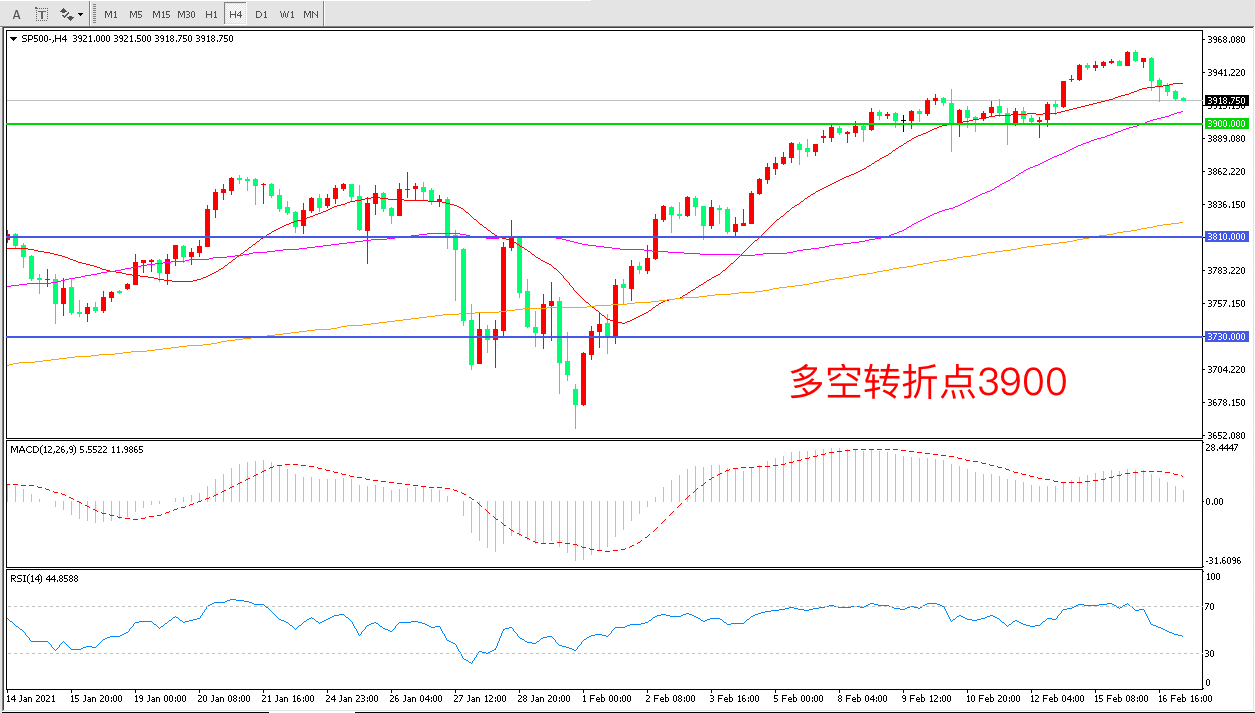 4小时图看,标普500延续高位震荡后长阳拉升,整体表现较强,3900成为下方明显支撑,均线系统呈多头排列,MACD红柱增加,RSI指标向上,日内延续上行概率较大。