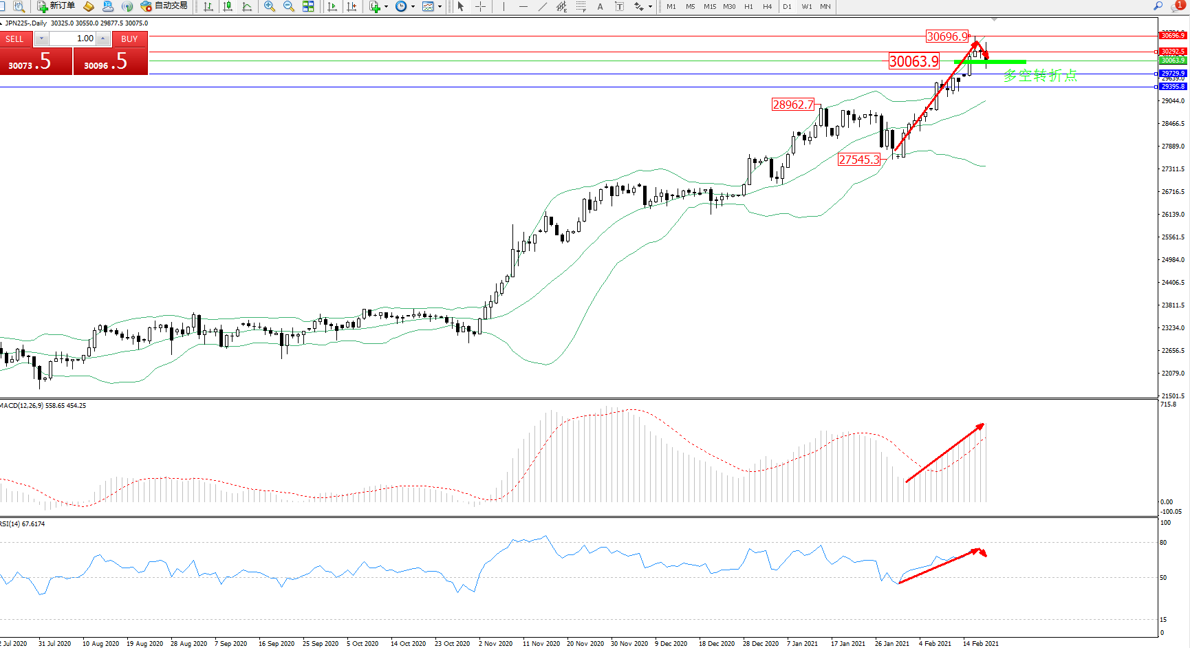 日经225指数2月18日(周四)收盘下跌43.19点,跌幅0.14%,报30249.00点。据日本时事通讯社:日本央行行长黑田东彦将与日本首相菅义伟会面。日本央行行长黑田东彦表示,与首相菅义伟讨论了最近的全球经济发展。讨论了日本央行3月份的政策评估。会谈没有谈及奥运会。对首相菅义伟表示,日本央行需要在3月份进行评估,以继续其宽松的货币政策。日本服务业支出仍然疲弱,但整体消费有所回升。出口已恢复到疫情前的水平,产出也有类似的恢复趋势。据日本公共广播公司NHK报道,日本前环境大臣丸川珠代将担任奥运担当大臣,接替料将出任东京奥组委新主席的桥本圣子。日本东京新增445例新冠肺炎确诊病例。