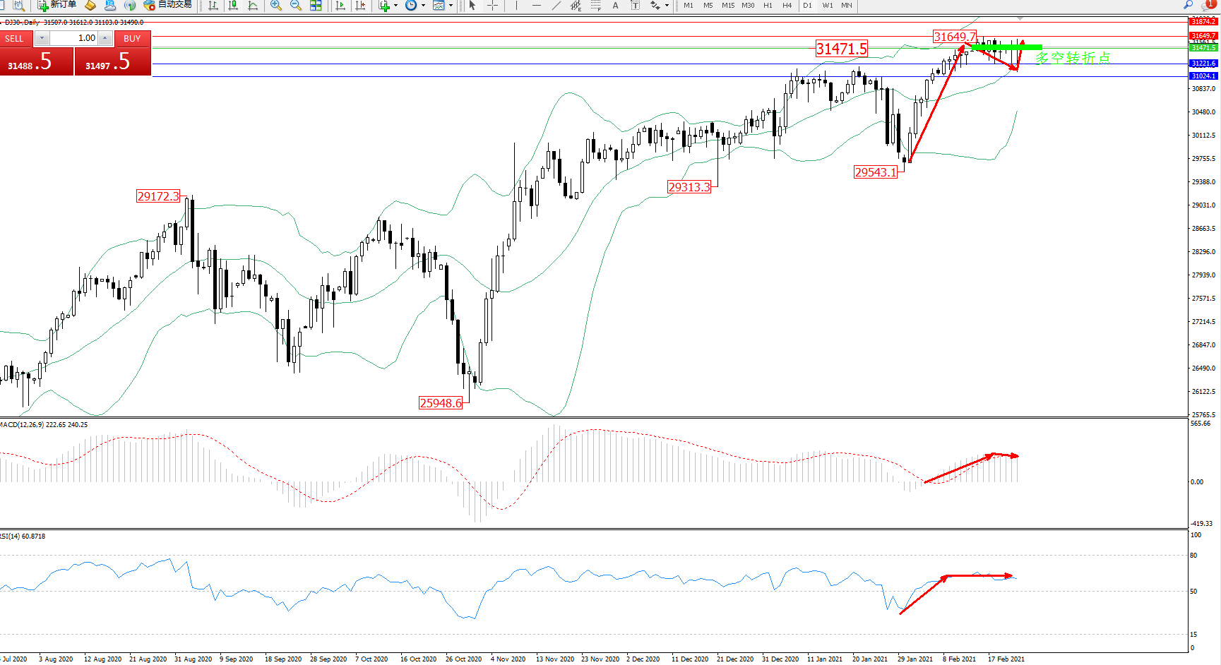 技术点评:高位呈V型反转态势强势拉升上扬,高位抵达31649附近节点遇阻开始维持窄幅整理,处于布林带指标中上轨区间持续震荡波幅扩张,触及中轨附近节点后得到短暂这次回升,布林带指标呈收口走势持续中,多头动力维持整理平移态势,MACD指标处于多头区域持续整理上移中,RSI指标处于多头区域维持持续徘徊整理中;