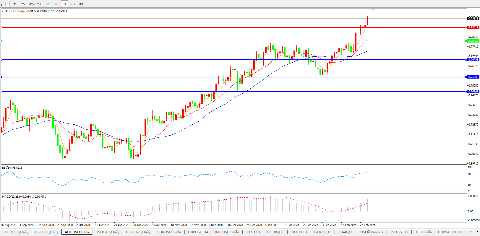 澳元兑美元在周三欧美时段延续涨势,周四亚市盘初触及三年新高0.7978,但之后在面临0.80关口阻力时进一步上行动能略显不足;推动澳元走强的因素除了疫情缓和带来的经济向好预期、以及由之引发的大宗商品期货价格走强外,也因为隔夜以来全球投资者对于国际贸易环境年内进一步好转更加寄予厚望。不过,投资者同样预计下周澳洲联储决议会释放更多鸽派信号,来阻止澳元过快升值,这会令汇价提前面临一定程度的压制。