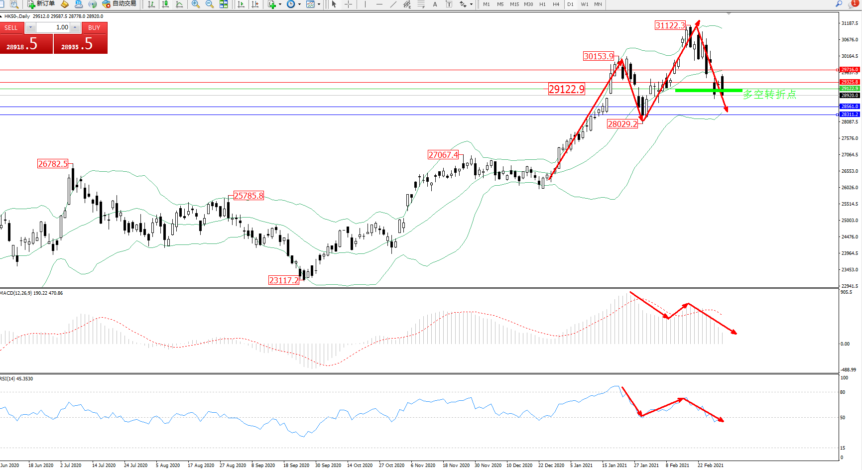 技术点评:多头动力延续布林带指标通道中上轨区间持续震荡上扬至31122位置遇阻回撤,纠结于中下轨区间持续震荡走势中,空头动力有进一步向下移动态势,跌势短期或难止步,布林带指标呈张口走势后开始收口,MACD指标处于多头区域持续震荡回撤,即将触及0轴线附近节点,RSI指标空头动力弱势下行至50均衡线下侧弱势徘徊中;