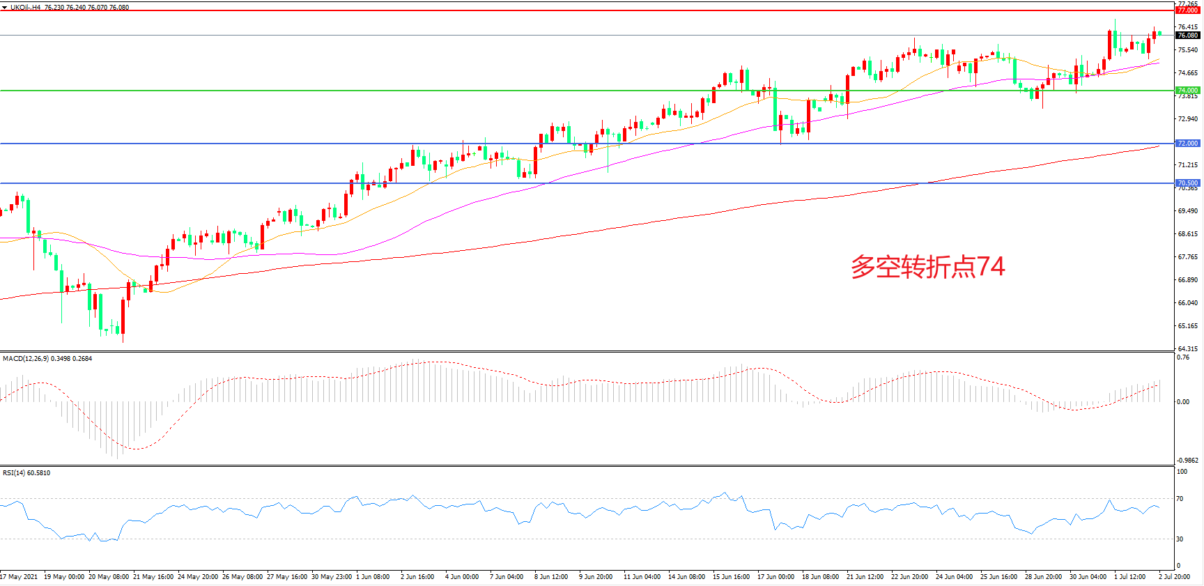 交易策略:在74.00之上看涨,目标77.00    80.00
