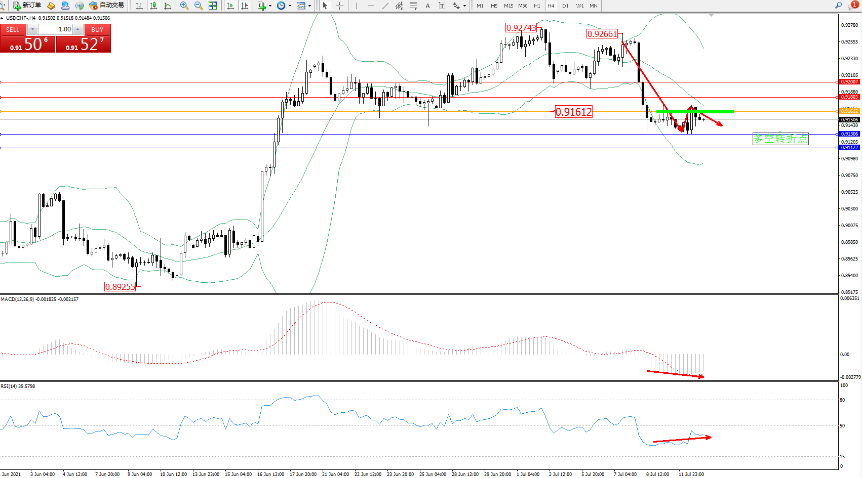 交易策略:0.91612下方看跌,目标0.91306、0.91122