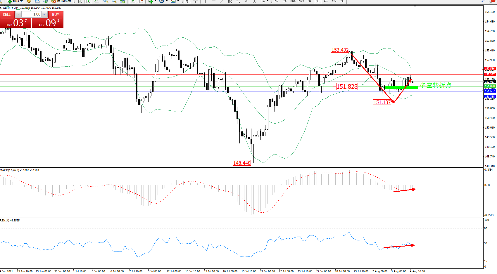 技术点评:空头动力延续布林带指标通道中下轨区间吃点下行,低位抵达151.137位置附近得到支撑反转震荡上移,触及中轨位置后整理中,布林带指标呈收口走势中,MACD指标处于0轴线下方空头区域维持整理平移,RSI指标处于50均衡线附近弱势徘徊中;