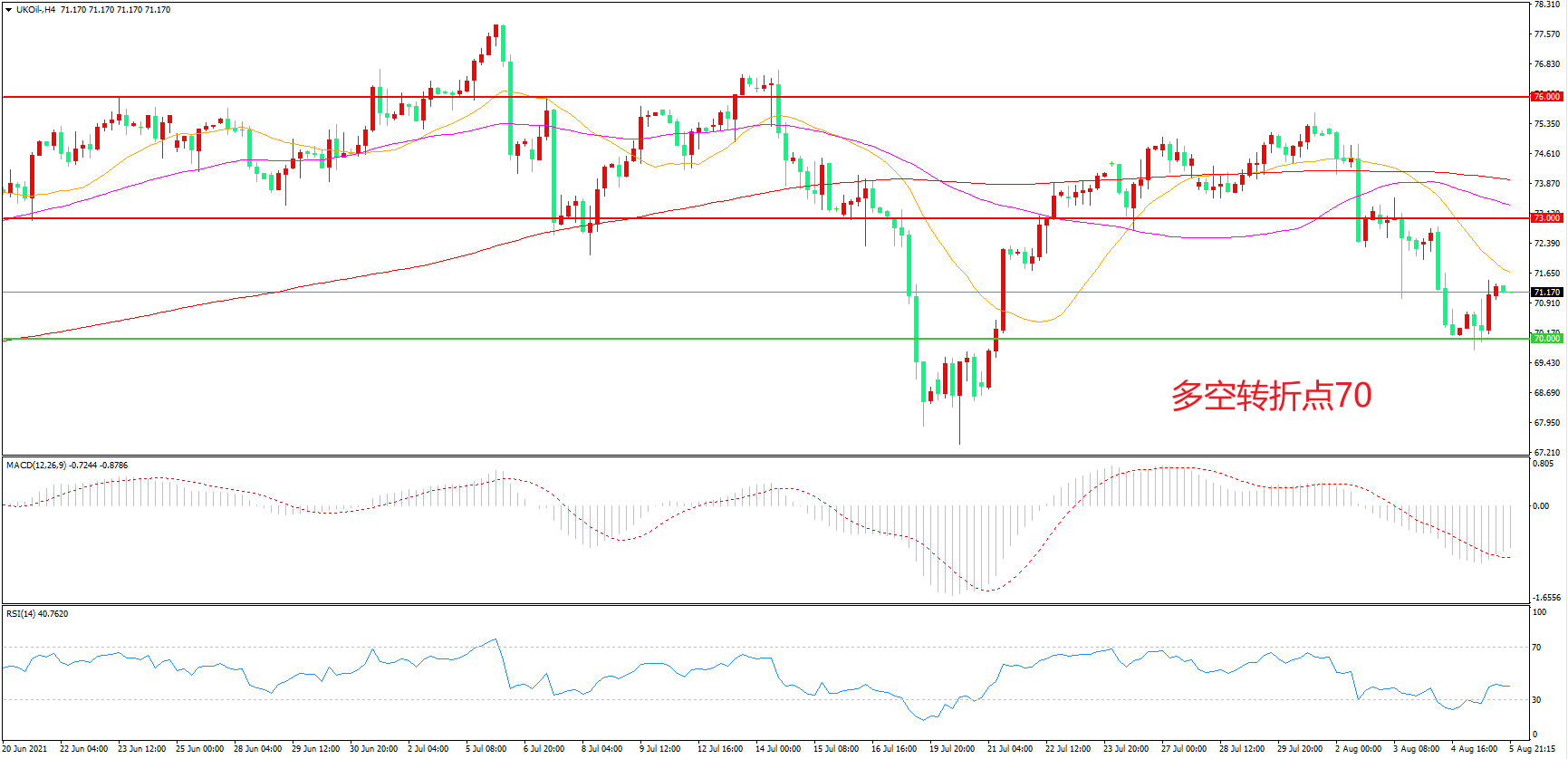 4小时图看,油价低位盘整后破位下行,整体表现低迷,均线系统成为上方阻力,70美元成为多空分水岭,MACD绿柱增加,RSI指标走平,日内震荡下行概率较大。