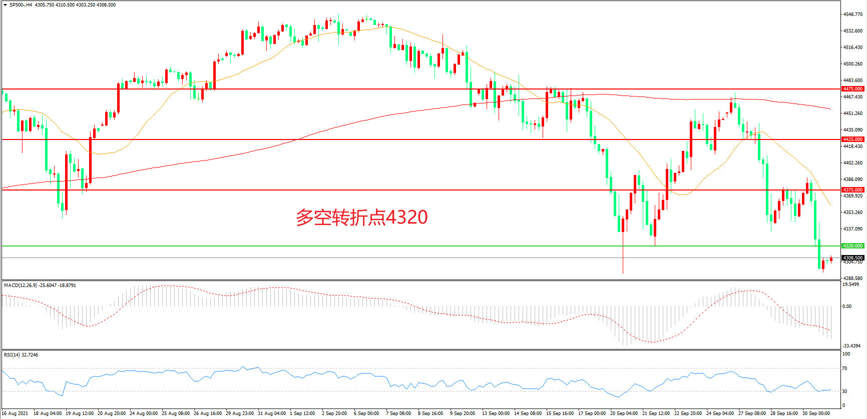 4小时图看,标普500长阴连续下破,整体走势偏空,短期均线拐头向下, MACD绿柱增加,RSI指标走平,日内震荡下行概率较大。