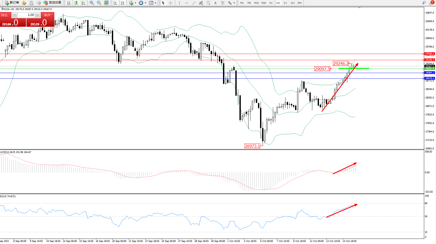 技术点评:多头动力延续布林带指标上轨附近持续震荡上扬,上方抵达29246附近整理,多头动力尚未有止步迹象,布林带指标呈张口走势持续中,MACD指标处于0轴线上方多头区域维持整理上移中,RSI指标处于多头区域维持震荡上扬后整理;