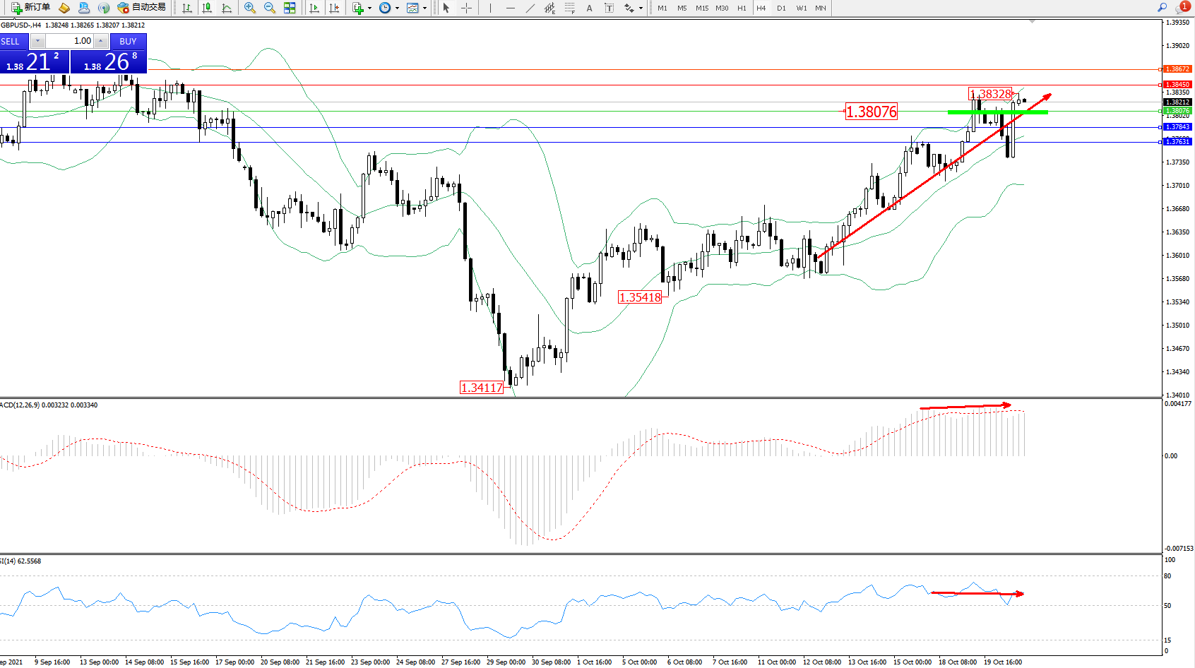技术点评:多头动力延续布林带指标通道中上轨区间持续震荡上扬,高位抵达1.38328位置持续震荡中,多头动力有进一步向上拉升态势,布林带指标呈上行趋势走势持续中,MACD指标处于多头区域维持整理平移,RSI指标处于多头区域维持窄幅整理中;