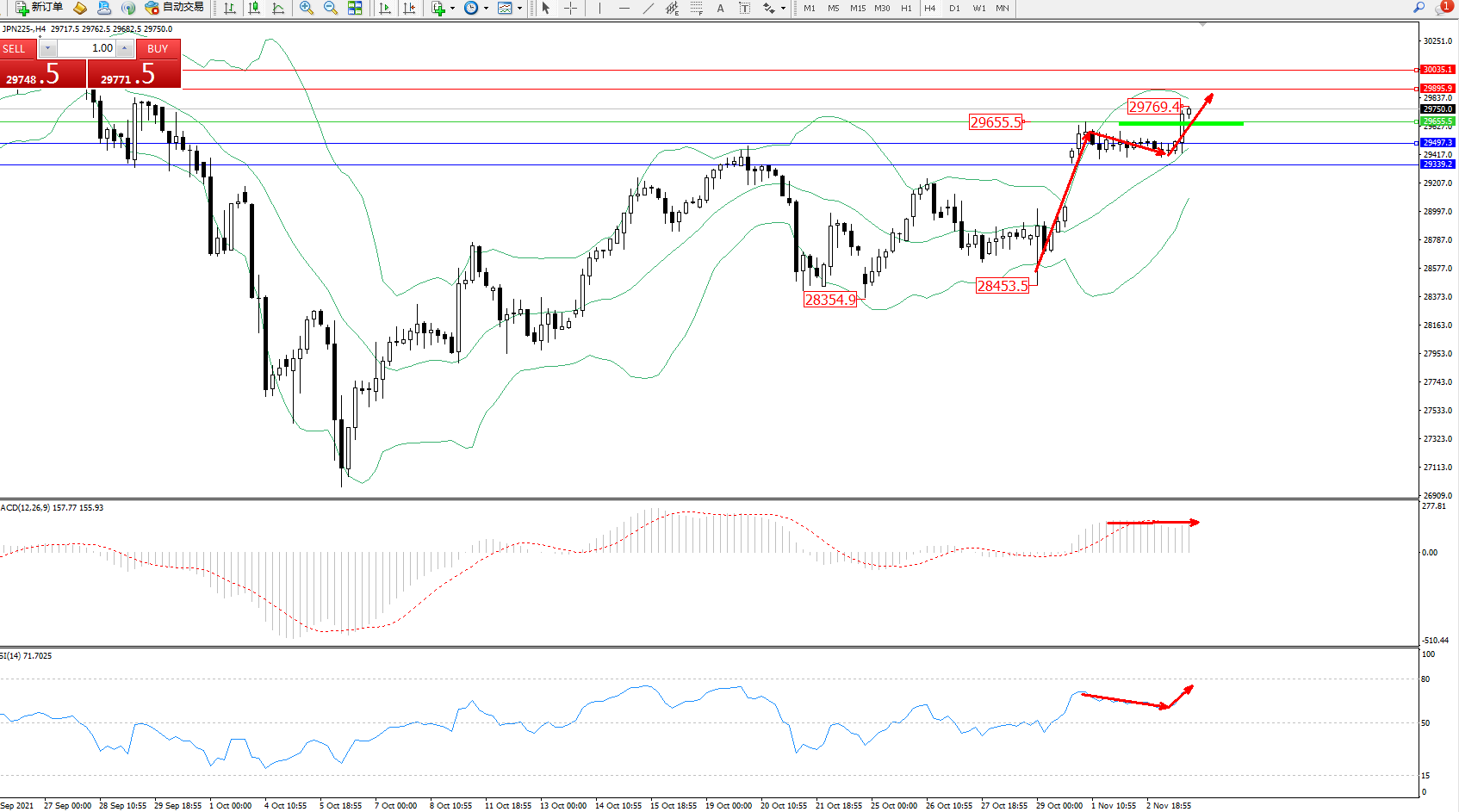 技术点评:低位多头动力强势高开整理后,多头动力再度震荡上扬,高位抵达29769附近开始整理,多头动力有进一步向上移动态势,布林带指标呈收口走势持续中,即将触及布林带指标上轨附近节点,MACD指标处于多头区域维持整理平移,RSI指标处于多头区域维持窄幅整理后有上移迹象;