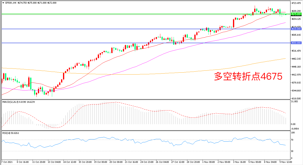4小时图看,标普500连续拉升后陷入震荡,多空博弈明显,均线系统走平,MACD红柱缩短,RSI指标走平,日内延续震荡概率较大。