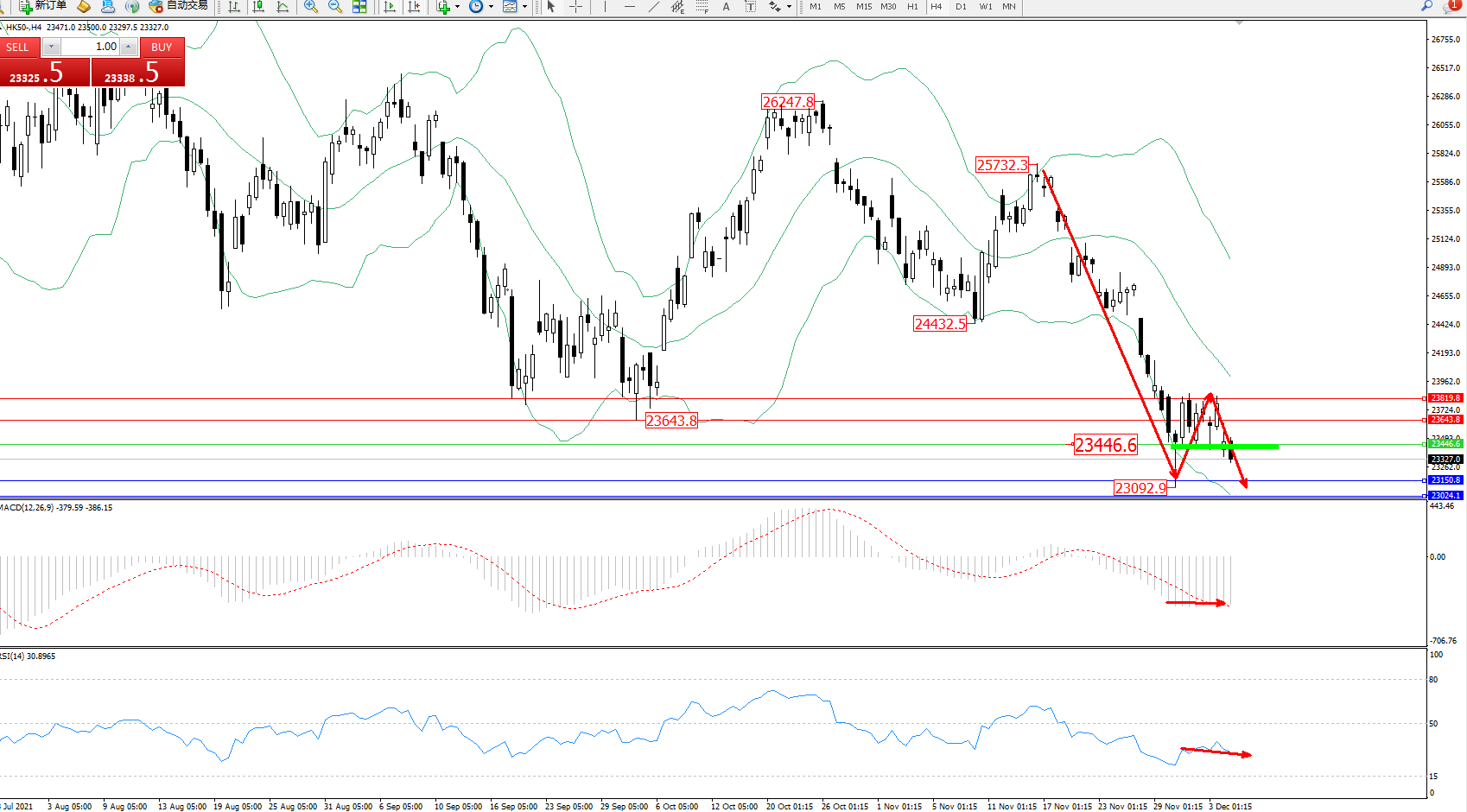 香港恒生指数12月6日(周一)收盘下跌417.31点,跌幅1.76%,报23349.38点;港股三大指数大幅收跌,互联网科技股再度下挫,致恒生科技指数大跌3.34%创历史新低,大型科技股阿里巴巴、百度皆跌近6%,阿里盘中创新低,网易、京东跌近5%,腾讯、美团跌超3%;恒大概念股尾盘跌幅进一步扩大,中国恒大大跌近20%,今日大市成交额为1700亿港元,南下资金逆势净流入46.74亿港元。受变异新冠病毒奥密克戎毒株蔓延、美联储收紧货币政策预期等因素影响,加密货币价格从3日深夜开始出现大幅下跌,比特币价格最大跌幅超过20%,一度跌破43000美元/枚。市场分析人士认为,奥密克戎毒株在多国传播、美联储预计将加快退出资产购买计划来应对通货膨胀,令资金从风险资产撤出,股票和加密货币等风险资产价格下跌。