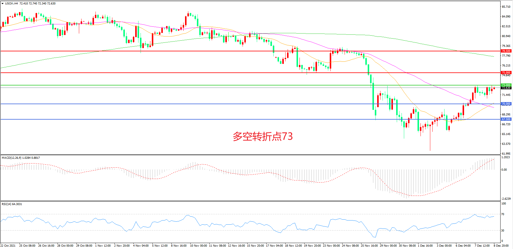 4小时图看,油价突破前期阻力后陷入调整,区间震荡迹象明显,70美元成为下方支撑,73美元成为多空分水岭,MACD红柱增加,RSI指标走平,日内震荡上行概率较大。