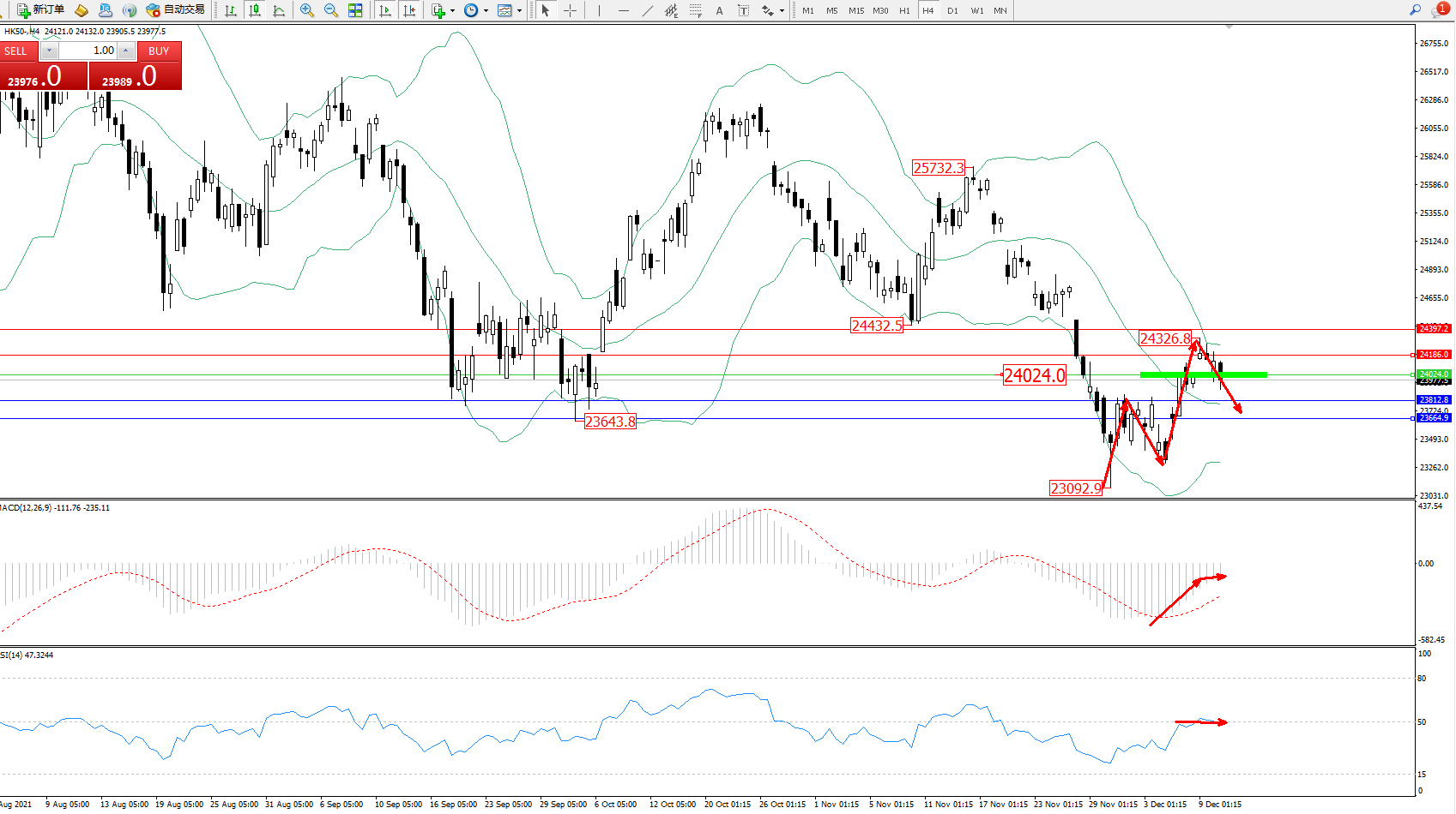 技术点评:低位多头动力呈阶梯式震荡上扬,高位抵达24326位置后遇阻震荡回撤,短期空头动力开始伺机入场,纠结于布林带指标中上轨区间震荡,布林带指标呈收口走势持续平移,MACD指标处于空头区域低位震荡上移后开始平移,RSI指标纠结于50均衡线附近弱势徘徊中;