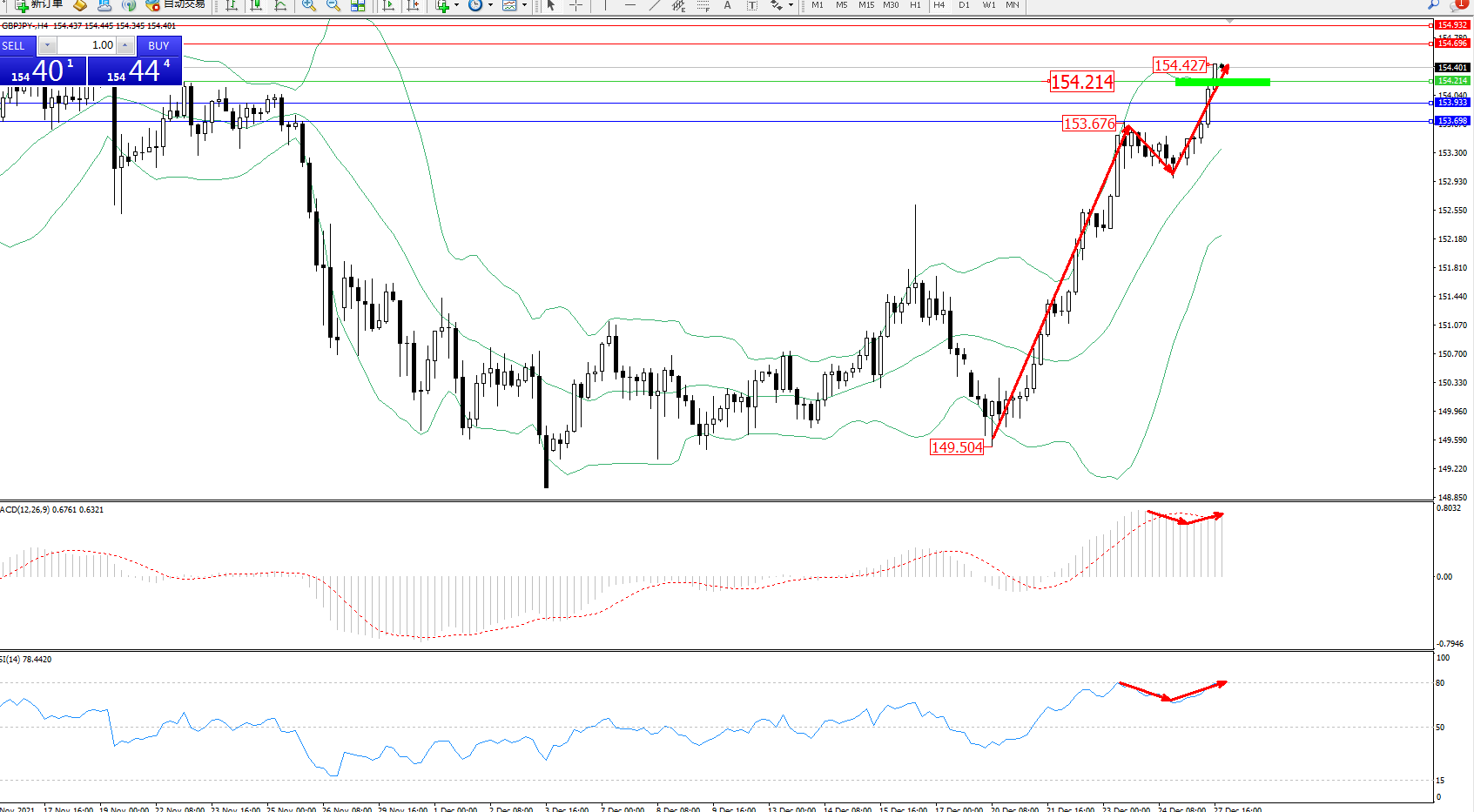 技术点评:多头动力延续布林带指标通道中上轨区间持续震荡上扬,高位抵达154.427位置后短期遇阻,多头动力有继续上扬态势,布林带指标呈高位收口后开始有张口迹象,MACD指标处于多头区域维持整理平移后开始上移,RSI指标处于多头区域高位震荡上移至超买区80均衡线附近徘徊中;