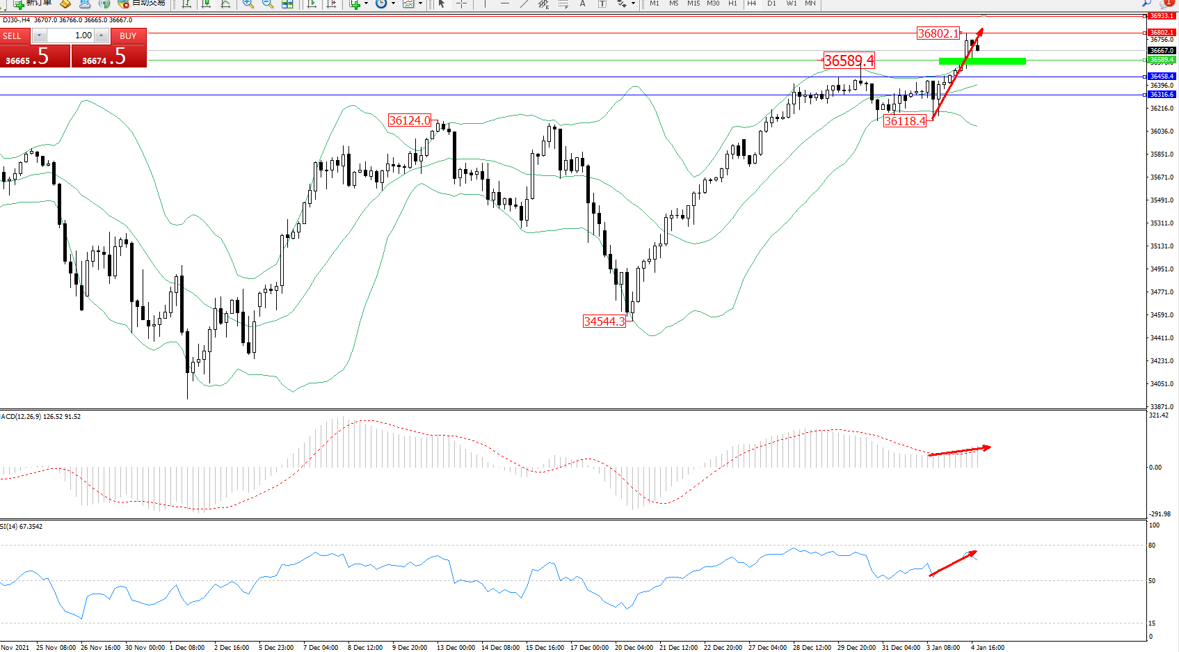 技术点评:多头动力延续布林带指标上轨附近持续震荡上扬,高位抵达36802位置遇阻震荡,短期或维持高位整理,布林带指标呈张口走势持续中,多头动力有继续上移迹象,MACD指标处于多头区域维持整理平缓上移,RSI指标处于多头区域持续震荡上扬;