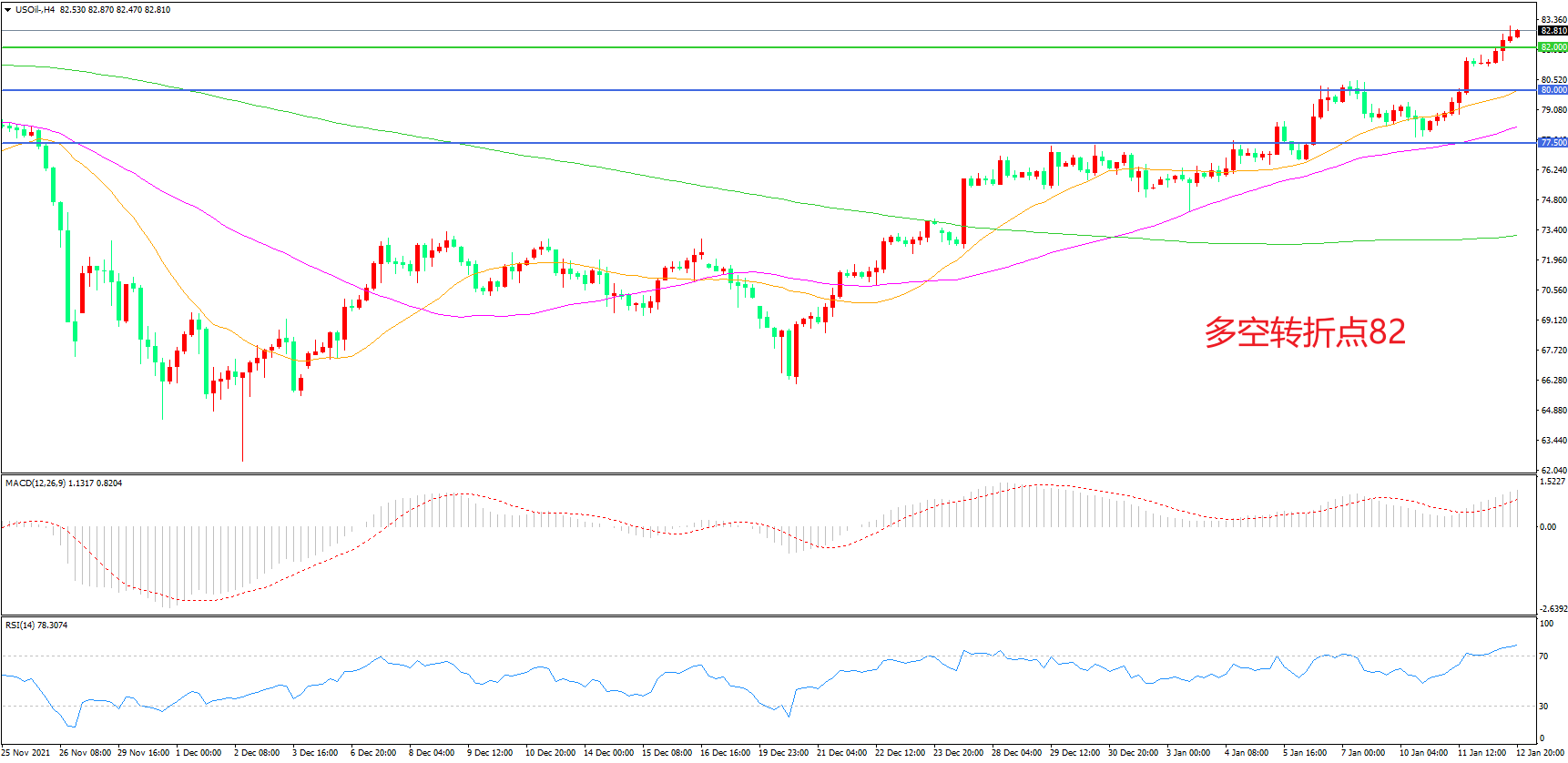 4小时图看,油价长阳拉升,突破前期整理区间,整体表现偏强,82成为多空分水岭,MACD红柱增加,RSI指标走平,日内震荡上行概率较大。