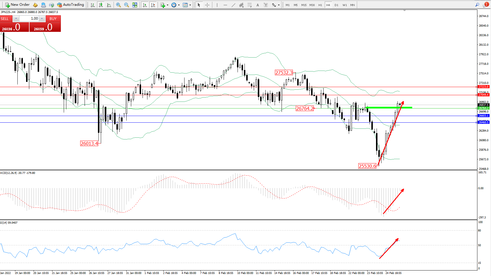 日经225指数2月25日(周五)收盘上涨482.68点,涨幅1.86%,报26453.50点。本财务大臣铃木俊一周五在东京举行的新闻发布会上宣布,日本政府已决定冻结俄罗斯三家银行的资产。据报道,三家被冻结资产的银行为俄罗斯政府附属银行VEB、与俄罗斯军队有密切关系的Promsvyazbank,以及Rossiya。