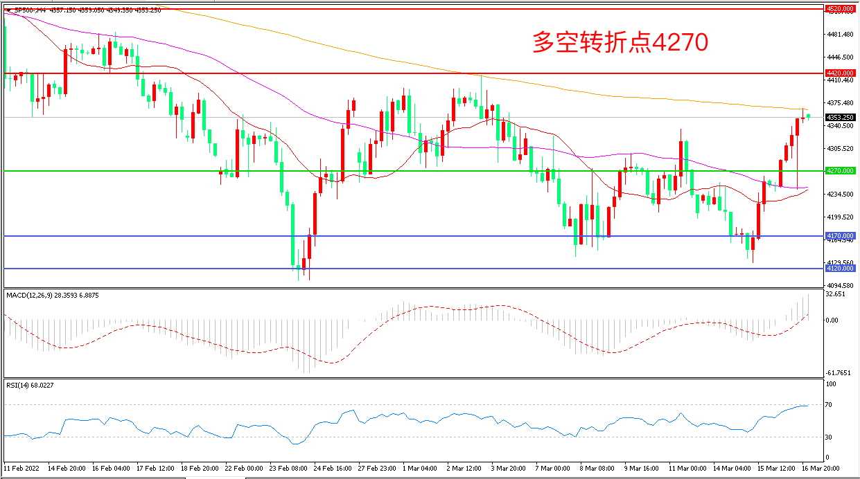 周三(3月16日),美联储如期加息并预计今年将加息六次,美股一度下挫,但俄乌可能达成停火协议的信息推高了风险情绪,标普500大幅拉升,收报4353.75点。中国方面,金融委及一行两会的“维稳“表态推高了中概股的表现,虽然美联储展示鹰派倾向,但并未有更激进的意外行动,美股有望维持强势表现。