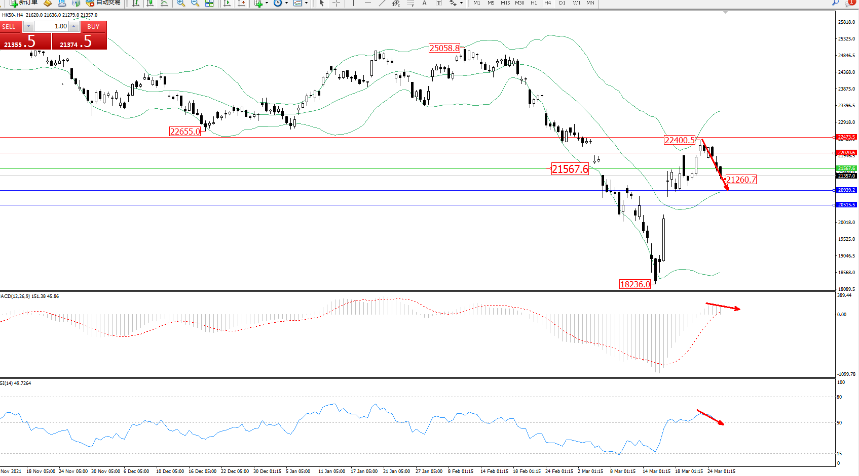 恒指HK50 ——4小时K线图显示: