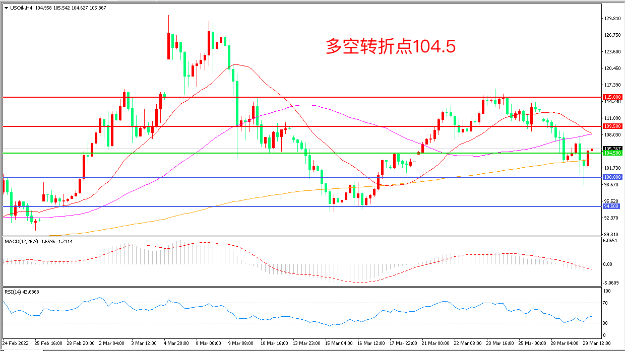 4小时图看,油价连续下挫后小幅拉升,短线有回暖迹象,104.5成为多空分水岭,MACD绿柱缩短,RSI指标走平,日内延续震荡概率较大。