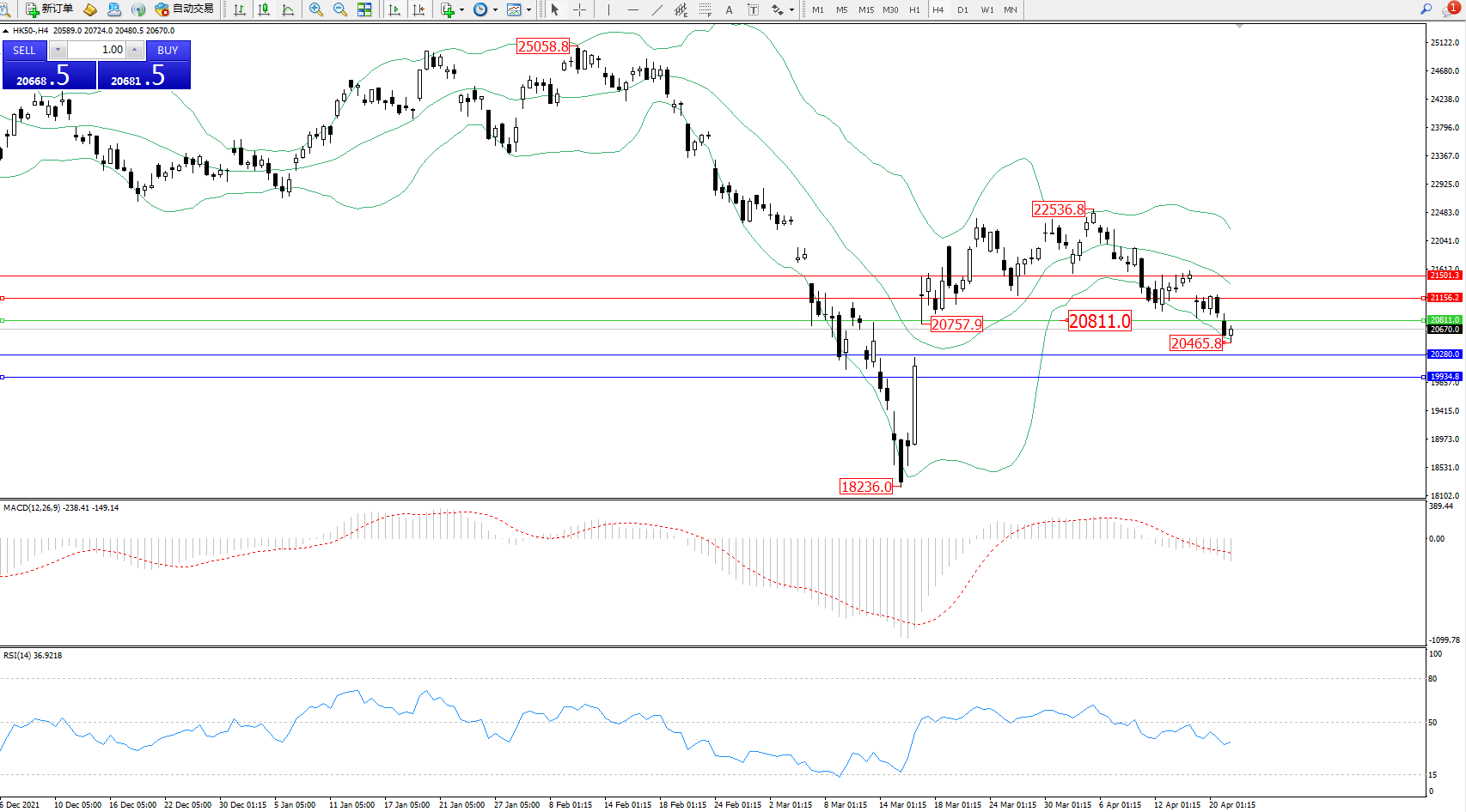 香港恒生指数4月21日(周四)收盘下跌262.45点,跌幅1.25%,报20682.22点;港股再度下跌,科技股领跌大市,致恒生科技指数大跌3.48%,失守4000点大关,3日连跌近8%,大型科技股京东跌6.5%,美团跌4.9%,小米跌超4%,腾讯、网易、阿里巴巴、百度均跌超3%;大金融股(银行、保险、券商)午后一度快速拉升,银行股多数收涨,香港本地股逆势走强。昨日完成20亿回购计划后或启动新一轮回购,汇丰控股涨超1.5%;内银股走强,招商银行反弹近1.7%;料二季度收入6.7至7.4亿美元,ASM太平洋涨近2%。