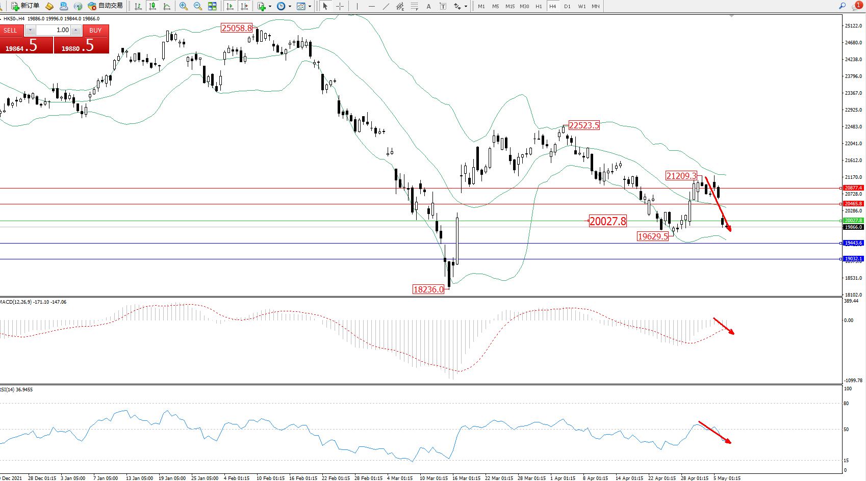 恒指HK50 ——4小时K线图显示: