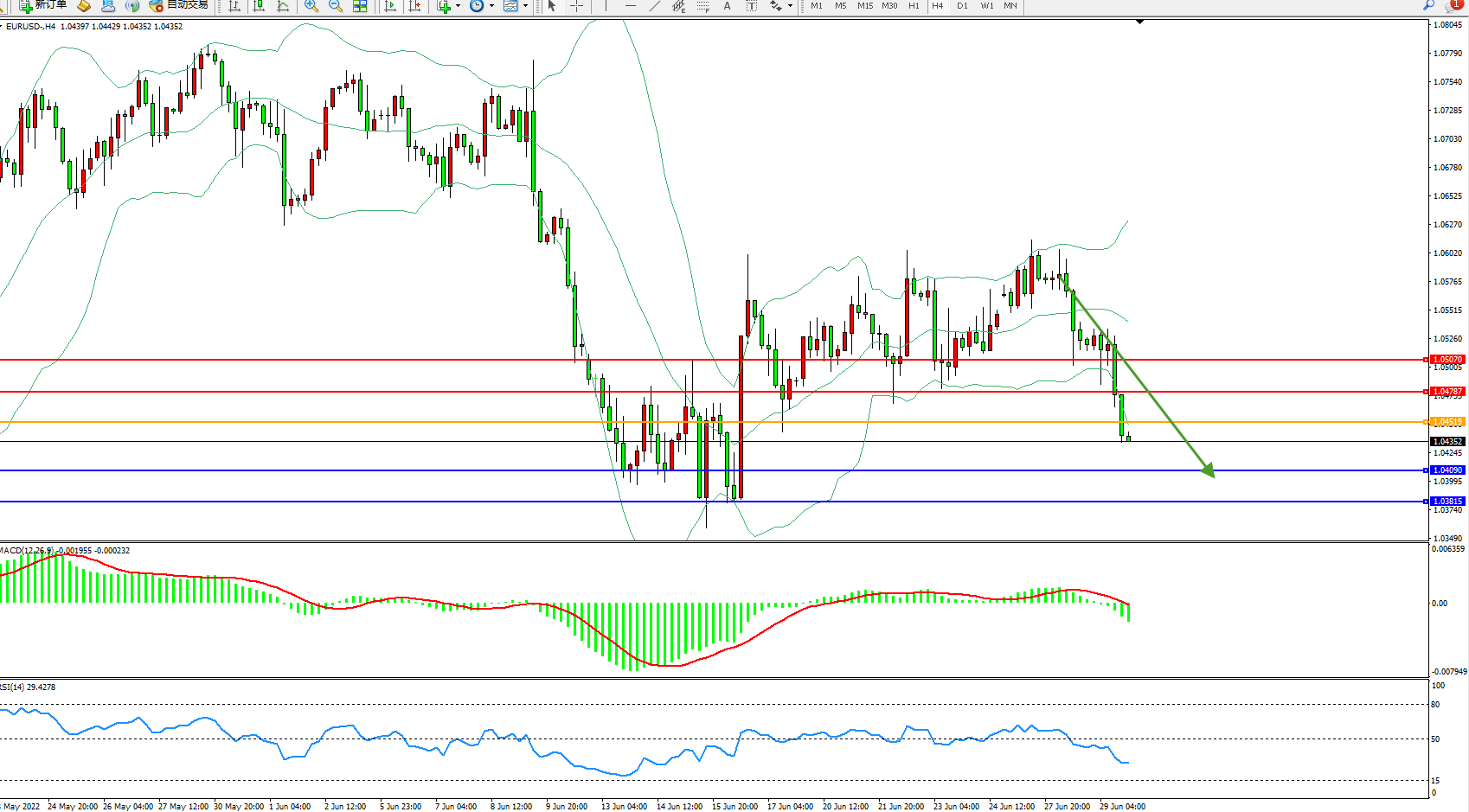 交易策略:1.04519下方看跌,目标 1.04090、1.03815