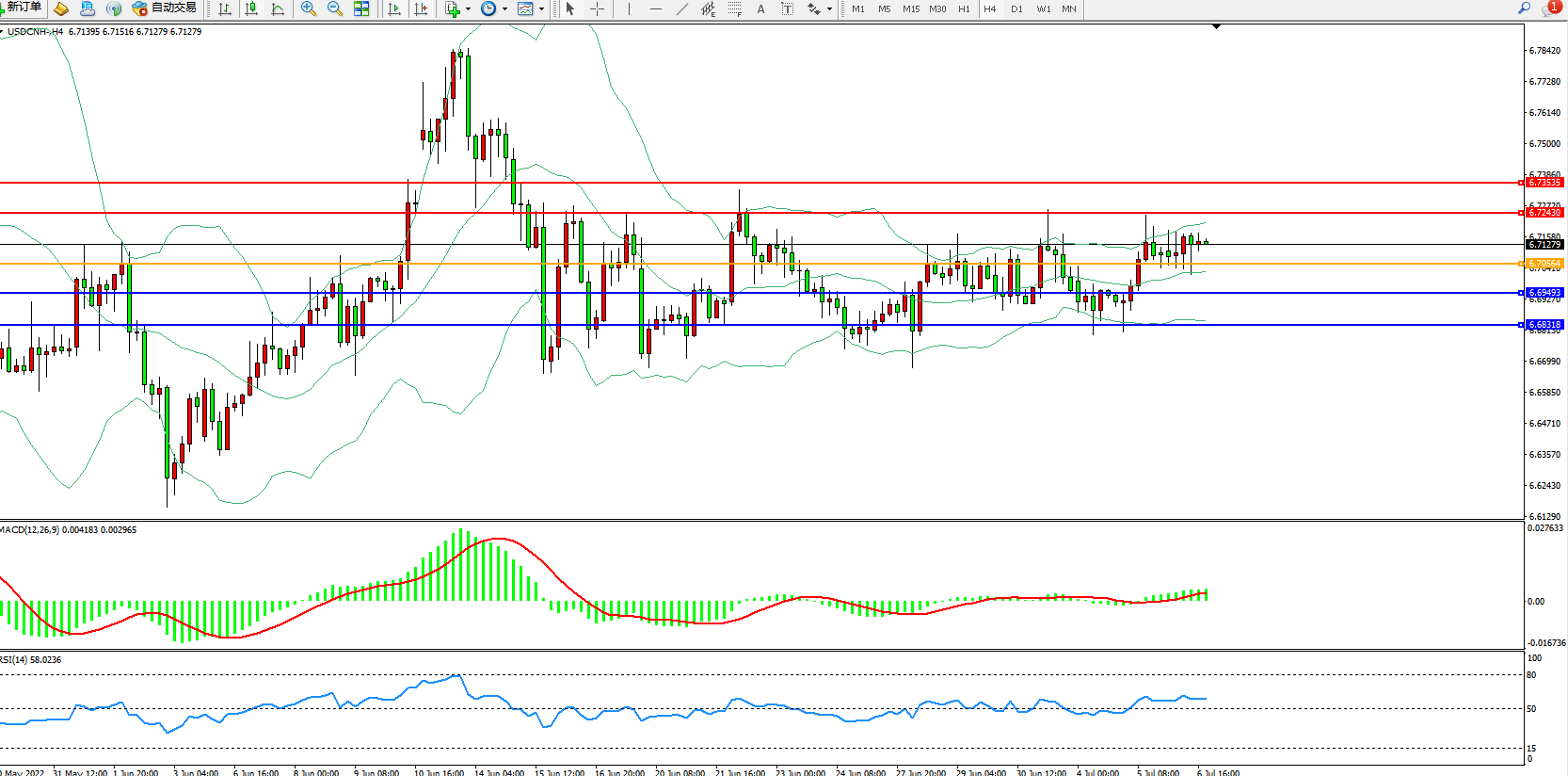 美元人民币USDCNH——4小时K线图显示:
