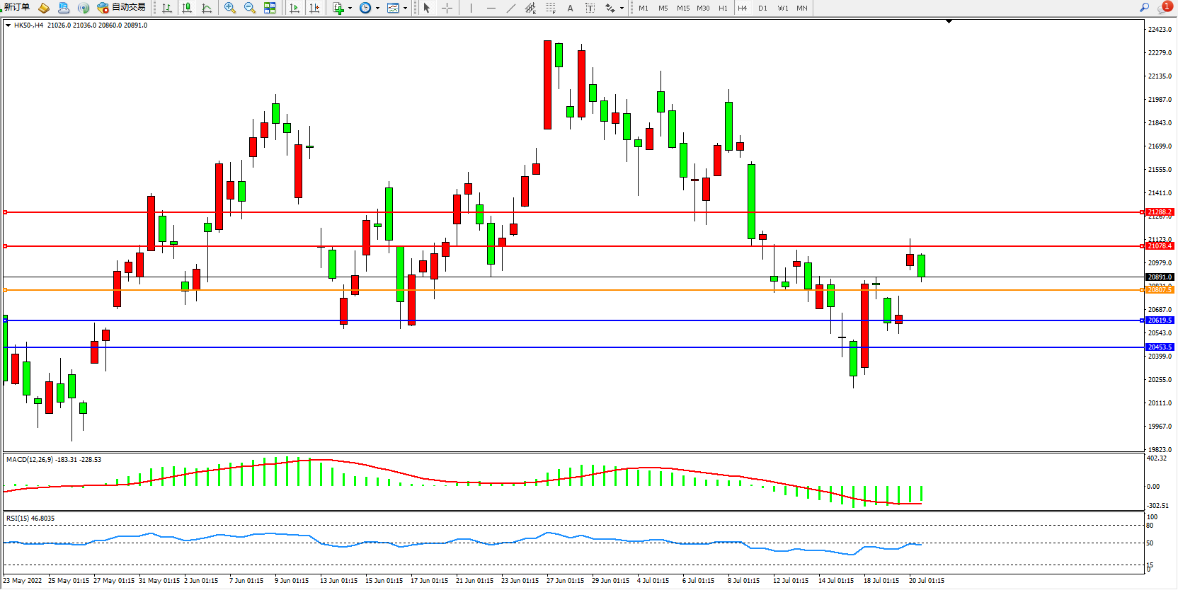 香港恒生指数7月20日(周三)收盘上涨229.16点,涨幅1.11%,报20890.22点;隔夜欧美股市大反弹,亚太股市应声上涨。港股全天保持强势行情,盘中一度收复21000点,恒生科技指数涨1.56%。受疫情影响的餐饮股、旅游及酒店股、濠赌股等集体拉升;军工股、黄金股、家电股、有色金属股齐涨。今日南下资金净流入20.62亿港元,大市成交额为893亿港元。