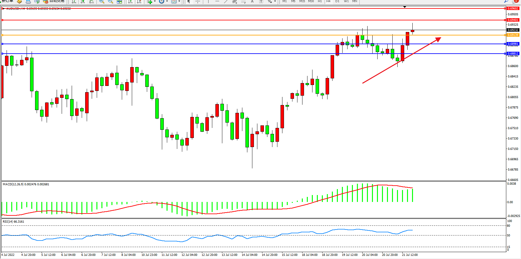 交易策略:0.69139上方看涨,目标0.69401、0.69602