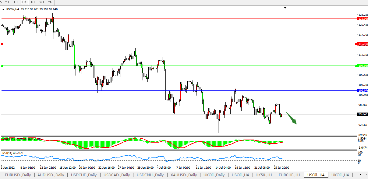 4小时图看:短线价格延续反弹但尾盘开始下挫, MACD量能柱0轴附近缩量,RSI指标走势平缓,短期价格反弹后继续下行概率较大。