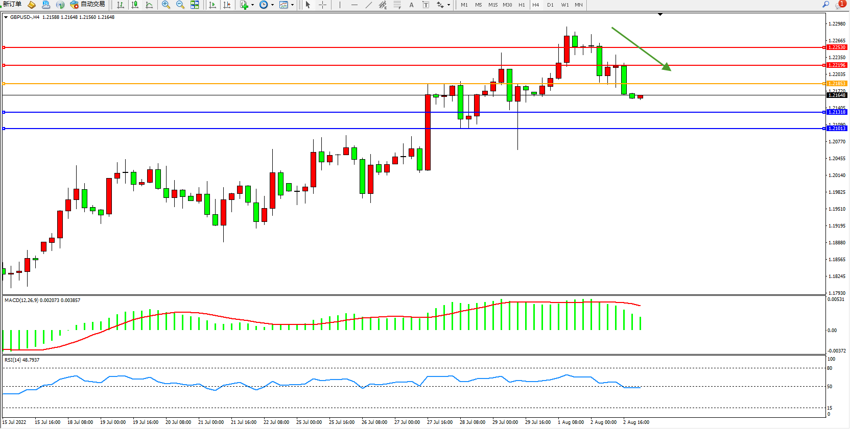 4小时图看:高位空头动力维持震荡回撤下行,短期市场空头动力入场,开始缓慢向下移动,MACD指标处于多头区域高位回撤下行,RSI指标处于50均衡线附近弱势徘徊;