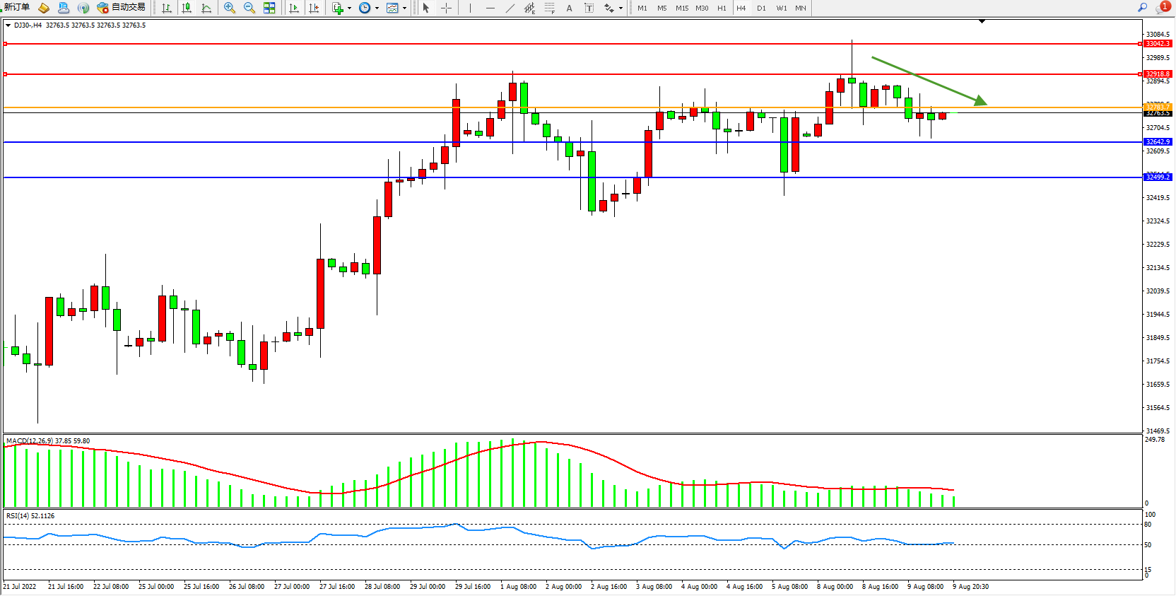 道琼斯指数8月9日(周二)收盘下跌56.29点,跌幅0.17%,报32776.25点;交易员等待关键的美国通胀数据出炉,以期寻找价格上升压力变化前景,并研判美联储继续推动大幅加息的必要性。