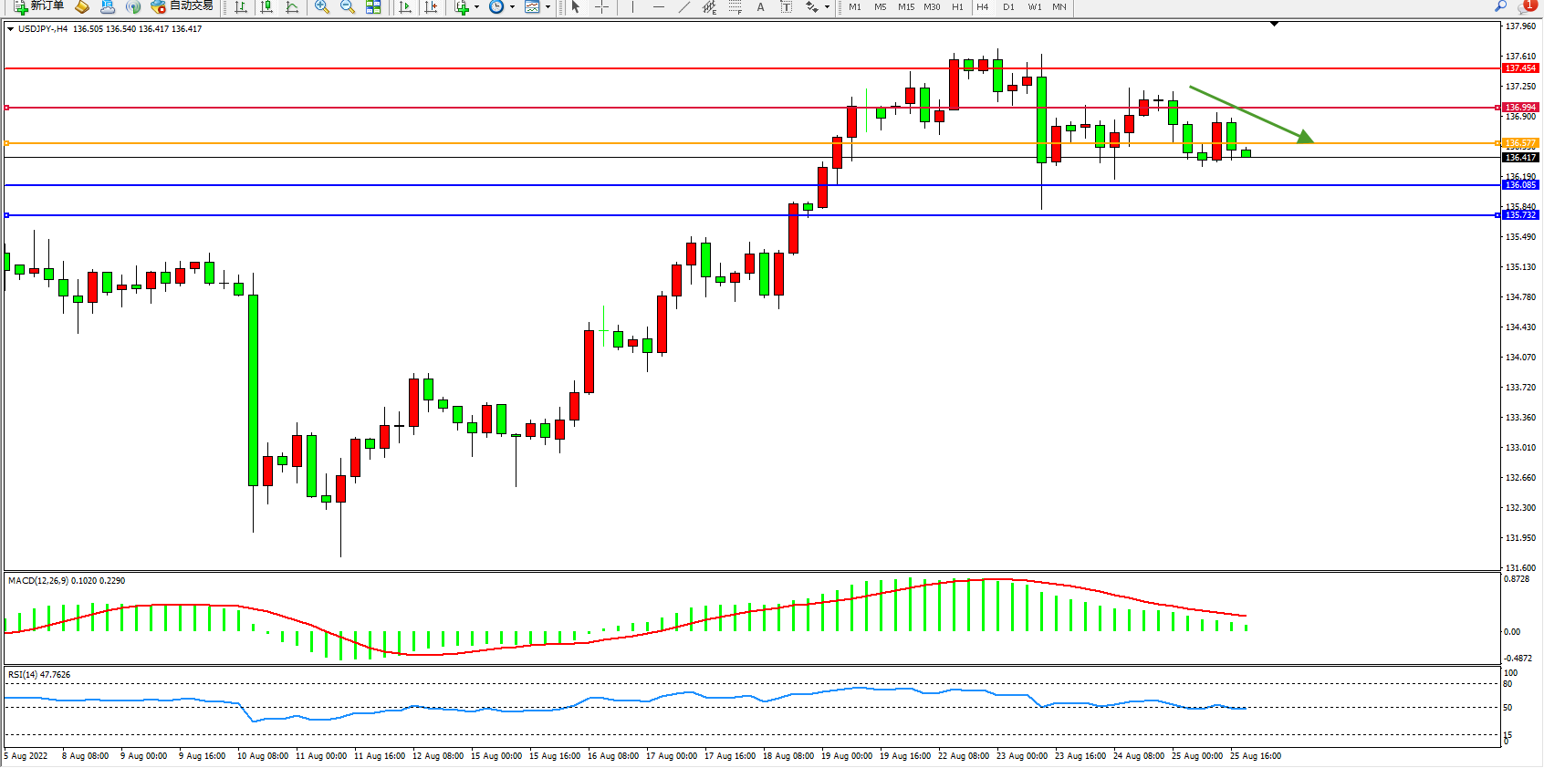 4小时图看:空头动力高位窄幅整理缓慢下行,市场空头情绪开始涌现,MACD指标处于多头区域维持整理还能下行至0轴线附近徘徊,RSI指标处于50均衡线附近窄幅整理;